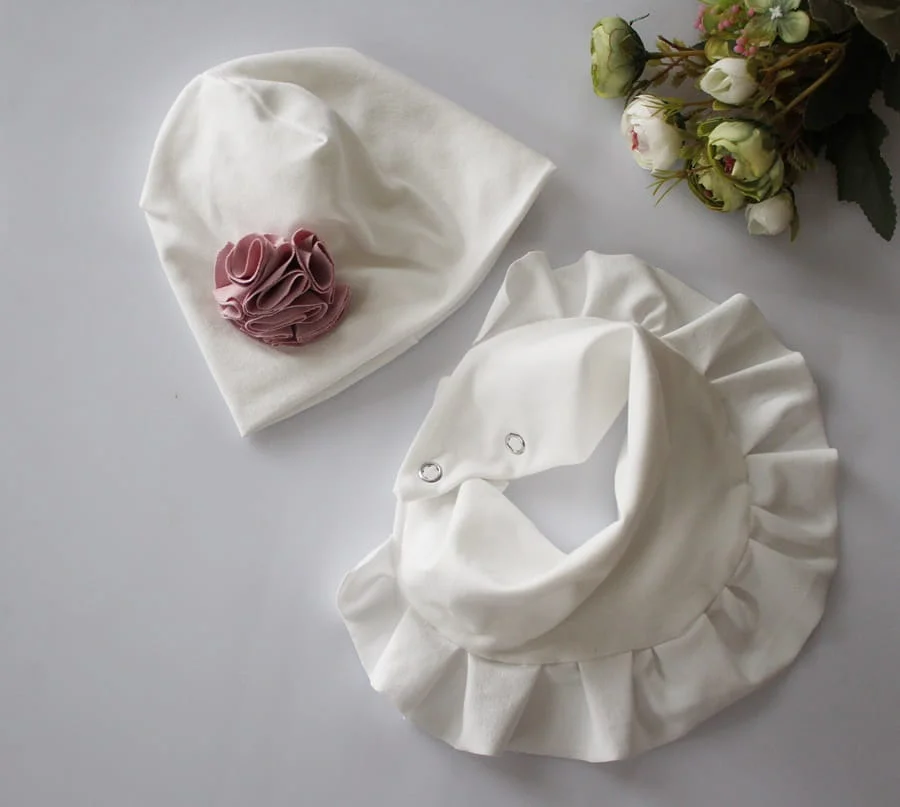 Zestaw czapka kwiat b.róż +chusta falbanka krem wiosna jesień chrzest