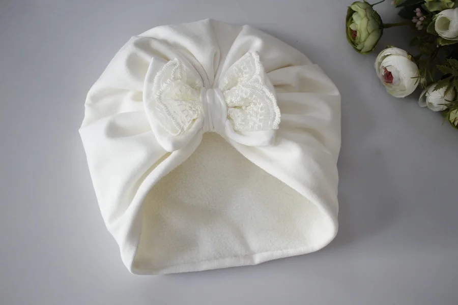 Czapka z kokardą koronka turban krem zima chrzest