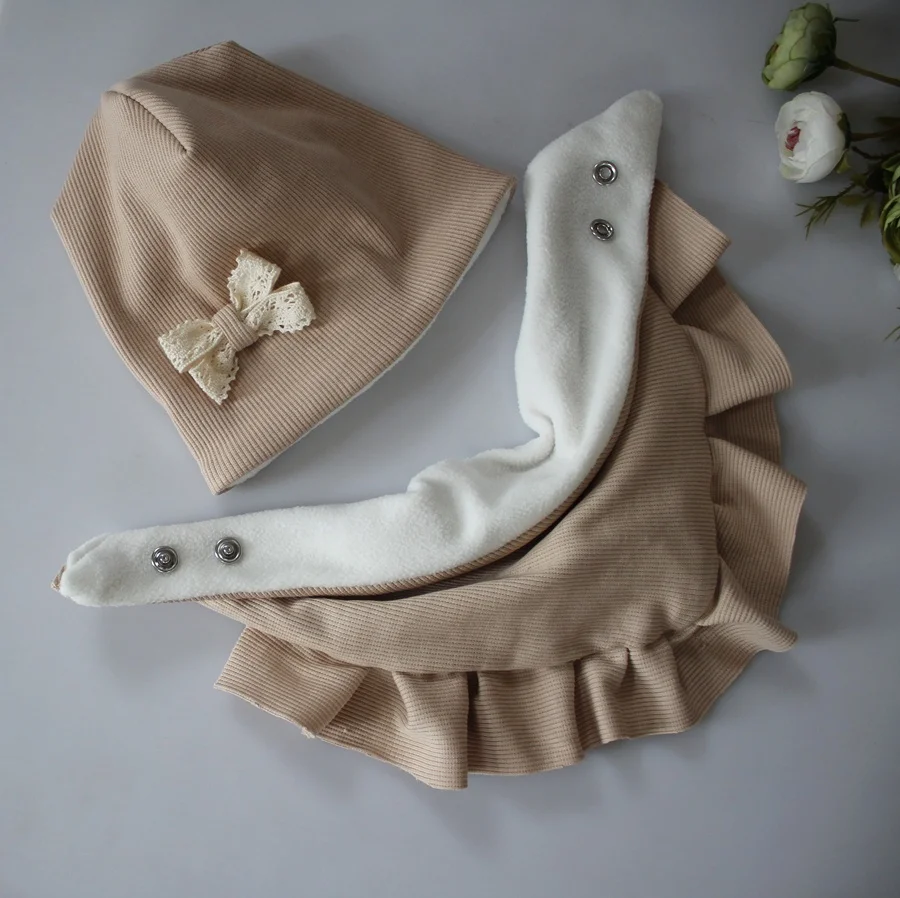 Zestaw czapka +chusta z falbanka beż prążek zima