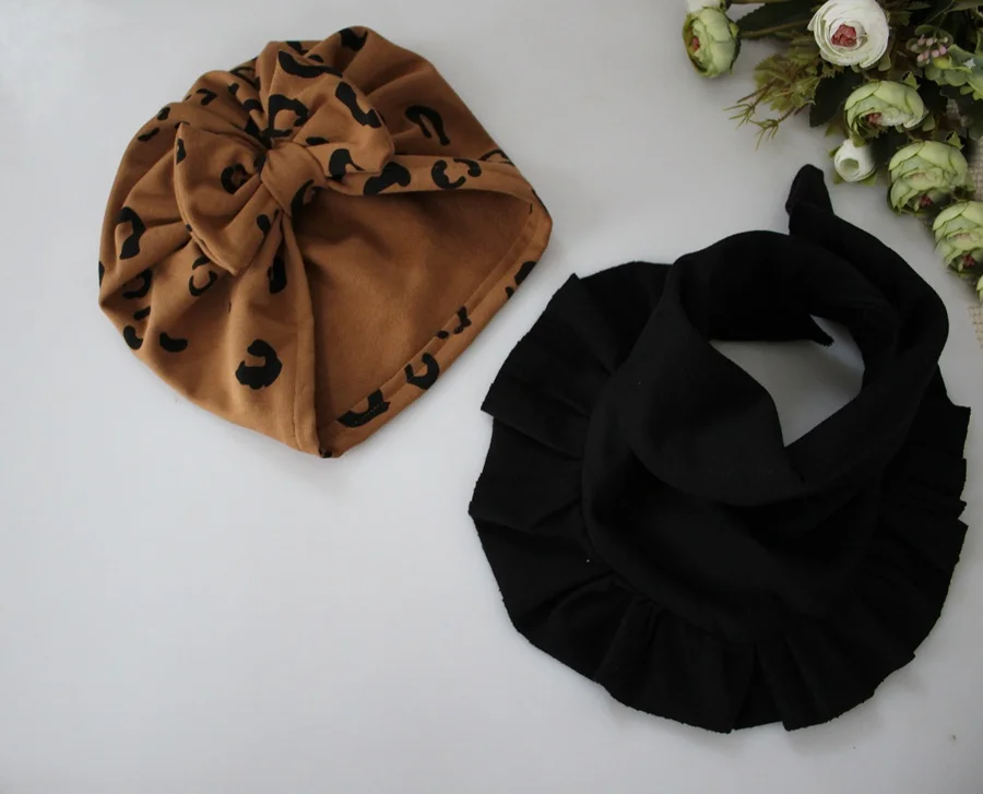 Zestaw czapka kokarda +chusta falbanka panterka karmel wiosna /jesień
