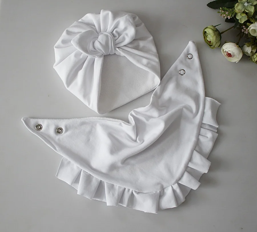 Zestaw czapka kokardka +chusta z falbanka biel chrzest