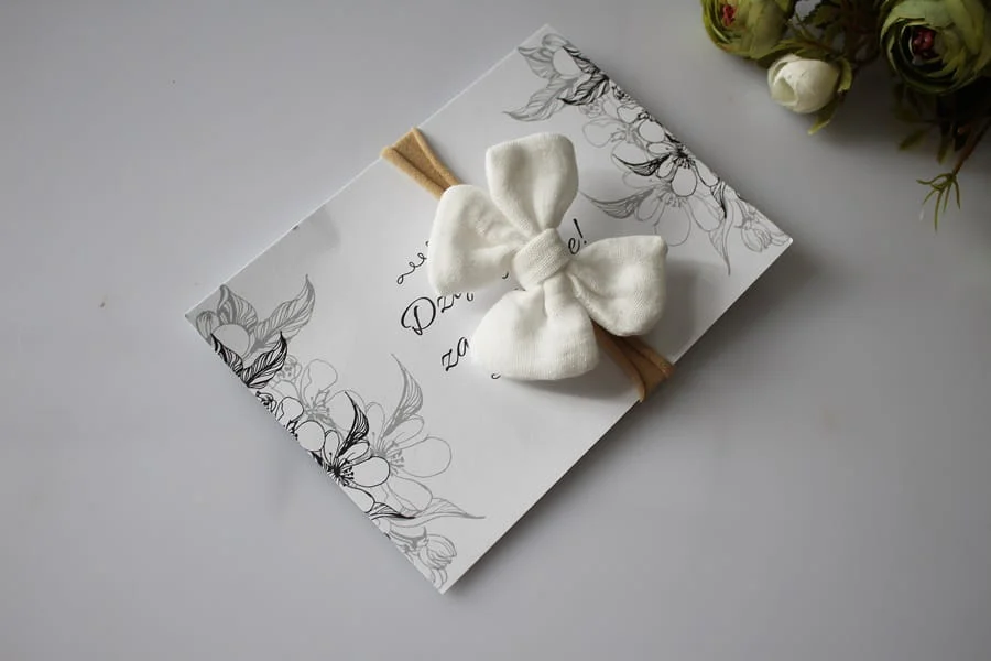 Kokardka dowiązana do cudownie miękkkiej ,elastycznej gumeczki.