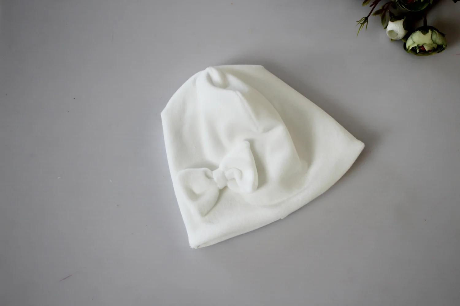 Czapka podwójna biała kokardka welur krem wiosna/jesień chrzest