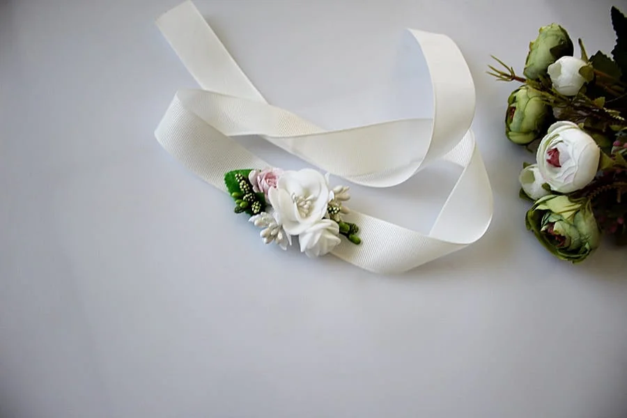 Pasek do sukienki kwiatuszki chrzest złamana biel i róż