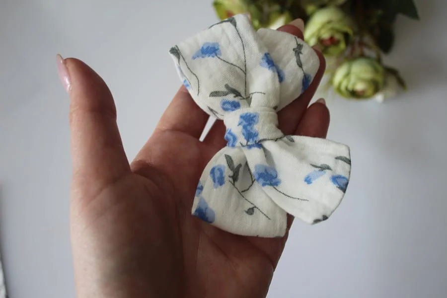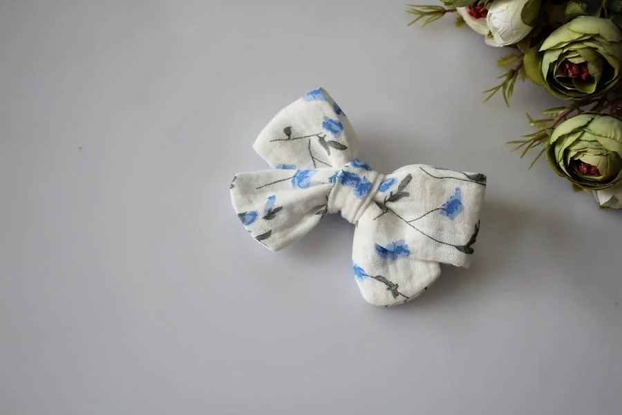 Spinka kokarda muślin niebieskie kwiatuszki na bieli