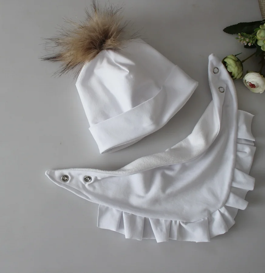 Zestaw czapka pompon +chusta z falbanka biel zima chrzest